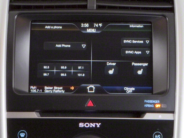 12 Speakers, 18 Chrome-Clad Wheels, 3.16 Axle Ratio, 4-Wheel Disc Brakes, ABS brakes, Air Conditioning, Alloy wheels, AM/FM radio: SIRIUS, AM/FM Stereo w/Single CD/MP3/Navigation, Auto-dimming Rear-View mirror, Automatic temperature control, Brake assist, Bumpers: body-color, CD player, Compass, Delay-off headlights, Driver door bin, Driver vanity mirror, Dual front impact airbags, Dual front side impact airbags, Electronic Stability Control, Equipment Group 300A, Exterior Parking Camera Rear, Four wheel independent suspension, Front anti-roll bar, Front Bucket Seats, Front Center Armrest w/Storage, Front dual zone A/C, Front License Plate Bracket, Front reading lights, Fully automatic headlights, Garage door transmitter: HomeLink, Heated door mirrors, Heated front seats, Illuminated entry, Integrated SIRIUS Travel Link, Leather-Trimmed Heated Bucket Seats, Low tire pressure warning, Memory seat, Occupant sensing airbag, Outside temperature display, Overhead airbag, Overhead console, Panic alarm, Passenger door bin, Passenger vanity mirror, Power door mirrors, Power driver seat, Power passenger seat, Power steering, Power windows, Premium audio system: Sony, Radio data system, Radio: Sony AM/FM Stereo w/HD Radio/MyFord Touch, Rear anti-roll bar, Rear Parking Sensors, Rear reading lights, Rear seat center armrest, Rear window defroster, Rear window wiper, Remote keyless entry, Speed control, Speed-Sensitive Wipers, Split folding rear seat, Spoiler, Steering wheel mounted audio controls, Tachometer, Telescoping steering wheel, Tilt steering wheel, Traction control, Trip computer, Variably intermittent wipers, Vista Roof.
